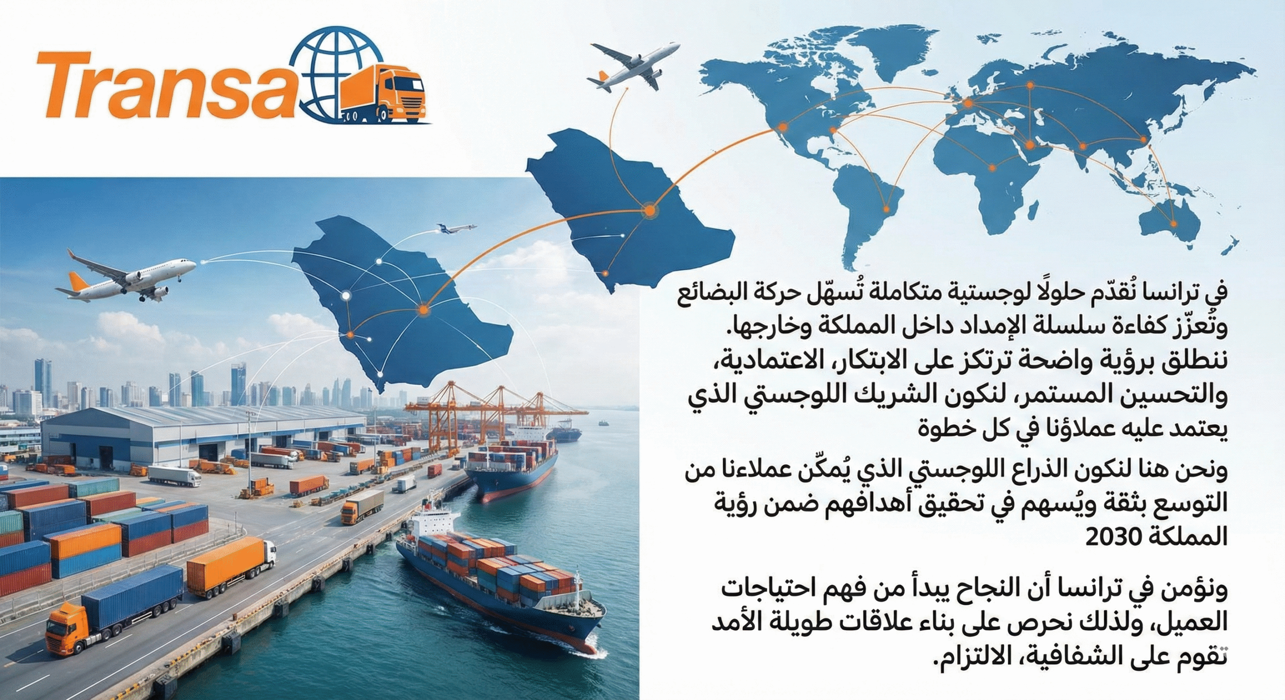 بناء اقتصاد قوي ومترابط يعتمد على الابتكار والتقنية والعمل المتقن ومن هذا المنطلق، نطمح لأن تكون ترانسا اسمًا مرادفًا للثقة والكفاءة، ورمزًا للجودة في عالم الخدمات اللوجستية الحديثة ونضع عملائنا في قلب كل قرار ونبني معهم شراكات طويلة الأمد قائمة على الثقة والالتزام لأننا نؤمن ان نجاحهم هو امتداد لنجاحنا.